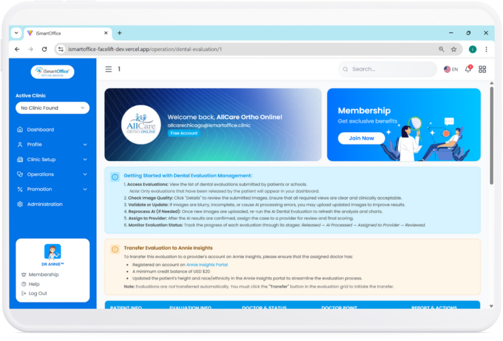 The DR. ANNIE™ Dental Evaluation section shows all dental evaluation cases submitted by patients through the iSmartOffice™ Patient app, securely released in compliance with HIPAA regulations.